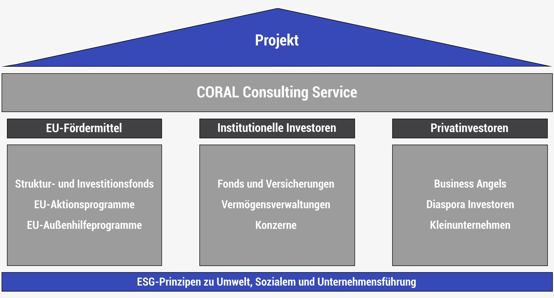 Damit Investments langfristig erfolgreich sind und nachhaltig Wachstum, Wohlstand und Verantwortung schaffen, setzt CORAL insbesondere auf drei wesentliche Investorengruppen: Institutionelle Investoren, Privatinvestoren und die Europäische Kommission als Stifterin der EU-Fördermittel.