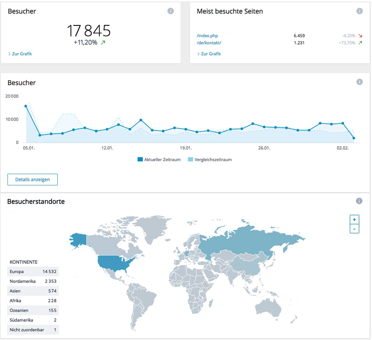 Kako se vidi iz prikaza dolje imali smo u periodu od 05.01.2023 - 02.02.2023 - 17.845 posjetitelja na našoj stranici. Najviše posjetitelja dolazi iz Europe 14.532, iz Sjeverne Amerike 2353 i iz Azijski zemalje 574.